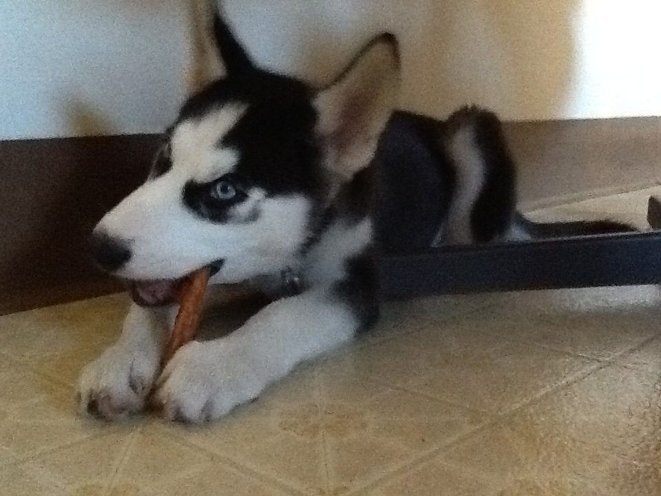 Description: Jack is a Siberian Husky puppy. In this photo, he is enjoying his first real bone.