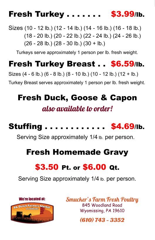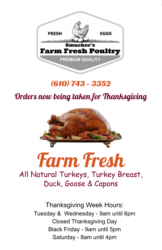 Smucker's Farm Fresh Poultry is new to the market, and has a wide variety of Farm Fresh Poultry and Eggs available. This page will have further content as more product information, images and content becomes available in the next few weeks. Please stop by our stand, and check out our selection of fresh, delicious and wholesome poultry products you and your family are sure to enjoy.